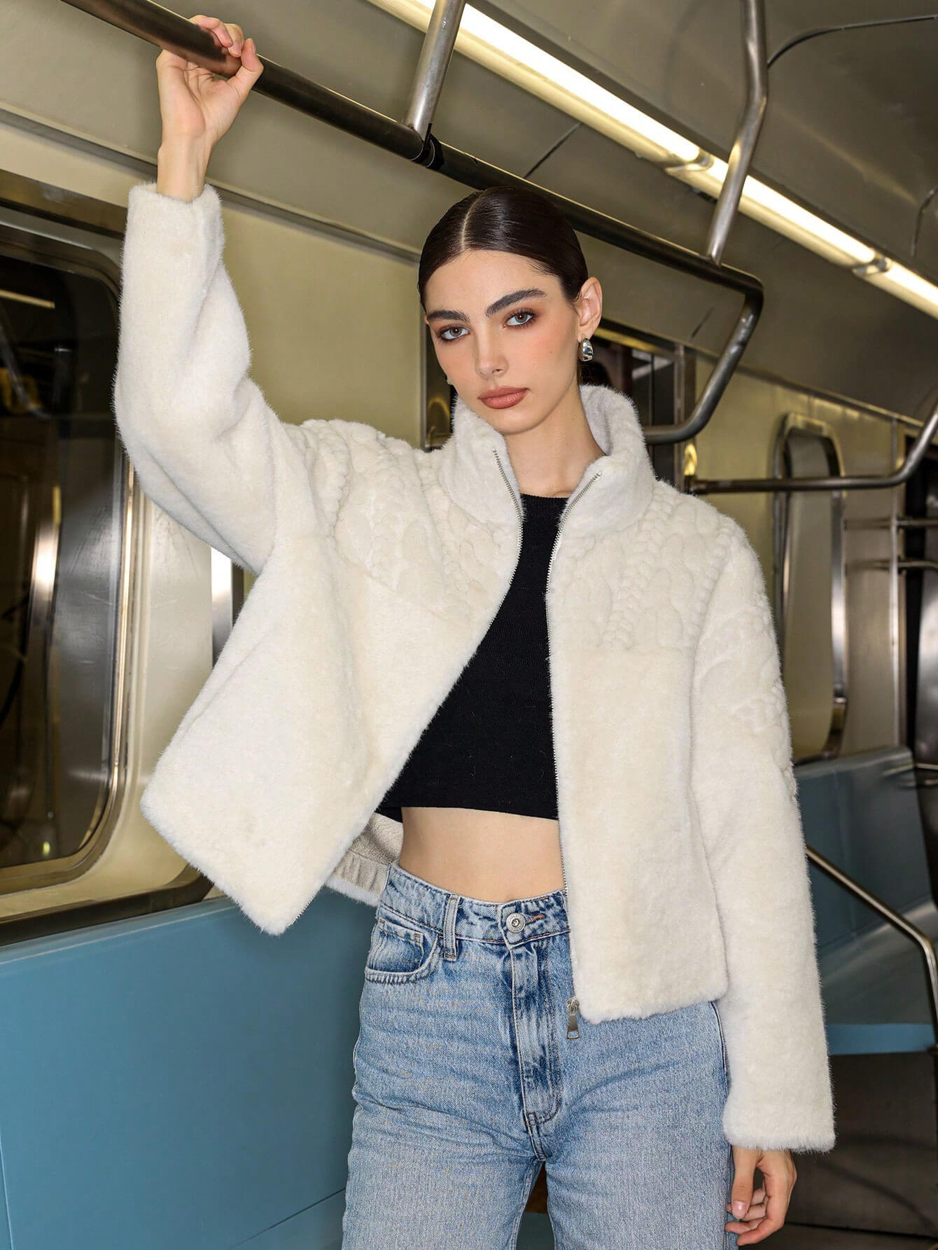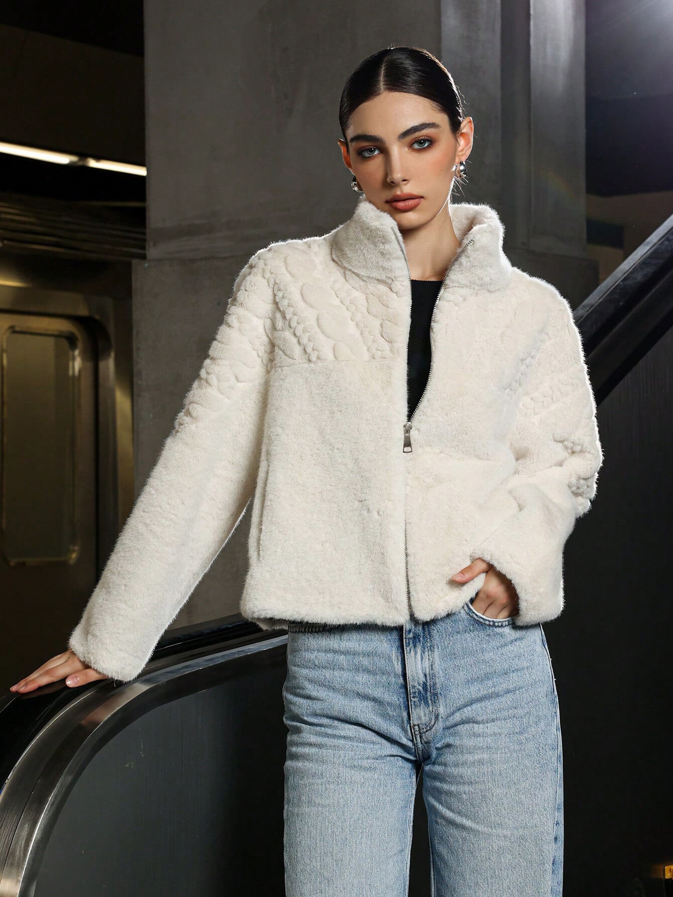 Este abrigo de lana de cuello alto es suave y cálido, y su diseño le da un aspecto más elegante. Añade texturas finas en la parte superior del cuerpo para realzar la sensación de capas.