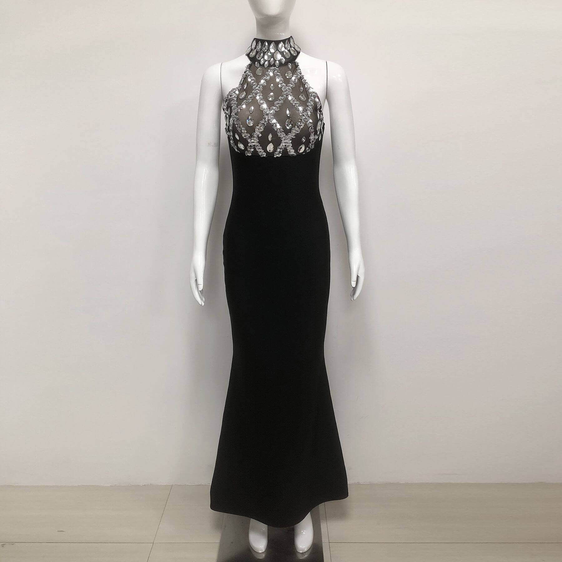 Il s'agit d'une longue robe noire sans manches, à col montant. Le buste est orné de sequins argentés et de strass, créant un magnifique décor.